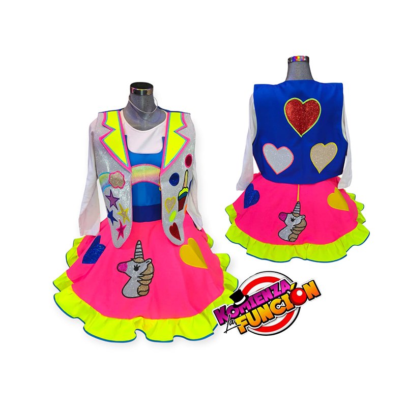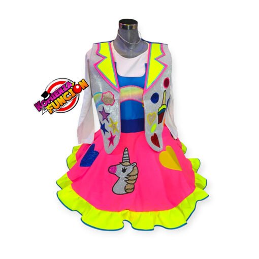 Traje dama colores neón Fiusha y amarillo neón bordados : unicornio , nubes helado corazónes
