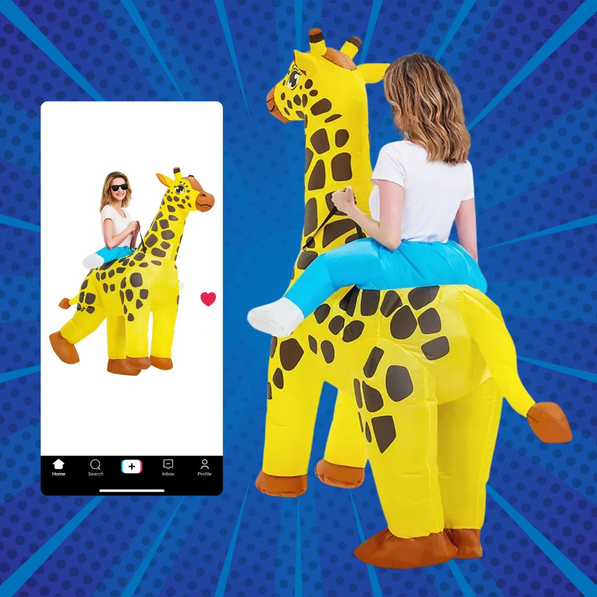 • Disfraz inflable de jirafa con función montable.